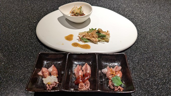 - 和牛のロースト 蕗味噌添え・ホタルイカ三種盛り・ヤーコンと蒸し鶏の利休和え