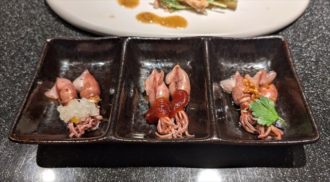 来ました!ホタルイカが3種の味付けで6杯も出てきたのが特に印象的。これはもしや富山人への挑戦状!?