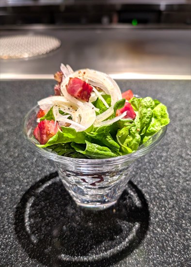 ごろごろとベーコンが入ったサラダ。さっぱりとしてメインへと続く口直しにもいいですね。