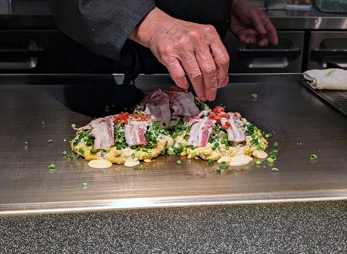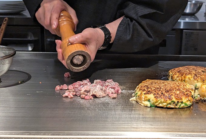 お好み焼きがある程度焼けてきたところで、今度は肉を焼いていきます。